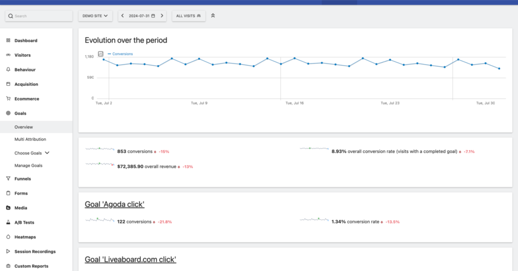 Section titled “Introduction to Matomo’s interface”Now, let’s look at the different sections in Matomo, I suggest taking a look at the interface yourself by visiting the demo version.