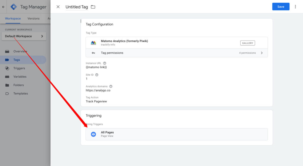Section titled “How to configure Matomo with Google Tag Manager”At this point, you hosted Matomo either on your server or used Matomo Cloud, but it’s not yet connected to your website. There are many ways to do this. We will use Google Tag Manager (GTM) to add the configuration script.