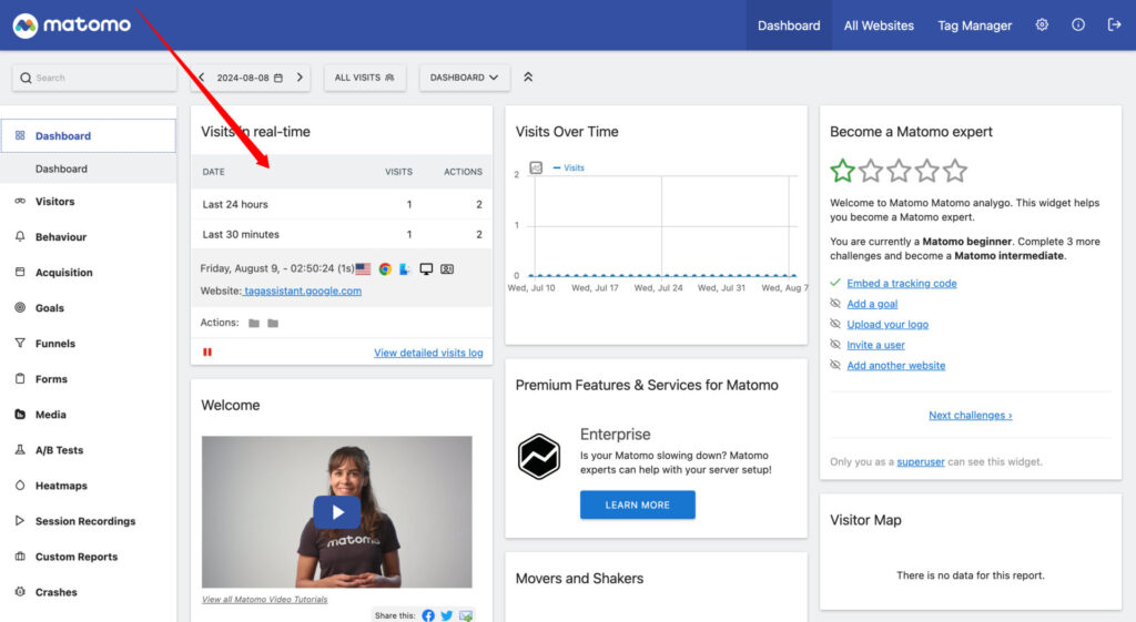 Finally, return to the Matomo screen and click the link at the bottom of the page to hide the screen. Go to the real time user report, and open your website in private mode.