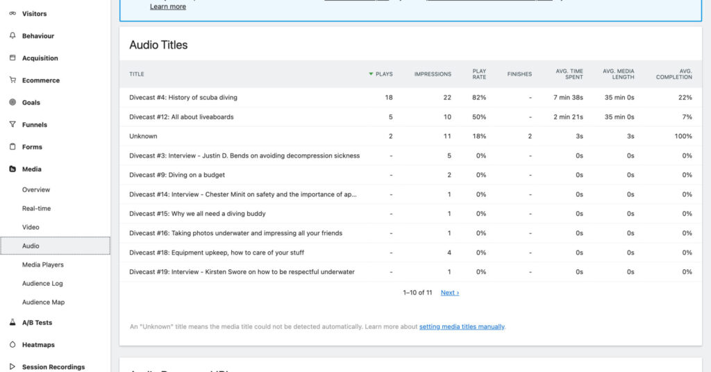 If you have a big content library, the media section is your go-to to track video/audio content performance.
