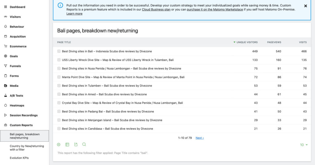 Section titled “Getting more out of Matomo via plugins”Although we did a nice round up of the main features and reports, you can go beyond the default features using plugins. You will have to pay for each extra plugin you get from the store.