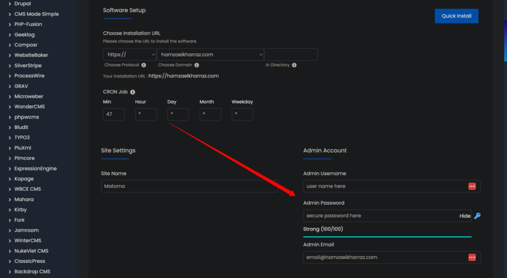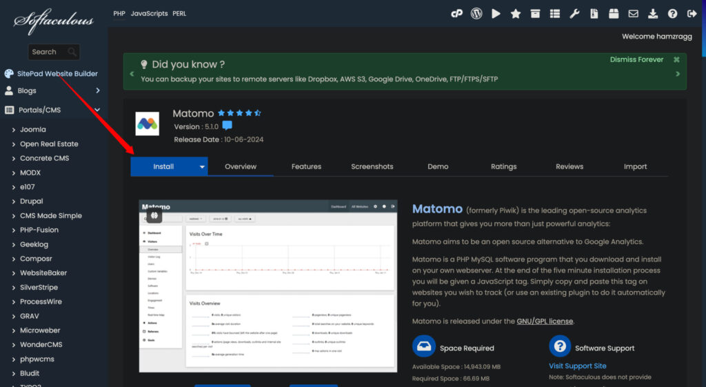 Next, Go to Softaculous, and search for ‘matomo’ using the left bar.