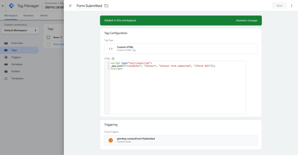 <script type="text/javascript">_paq.push(["trackEvent", "Contact", "Contact form submitted", "{{Form ID}}"]);</script>In our Google Tag Manager container, we will add a new GTM tag and paste the script.