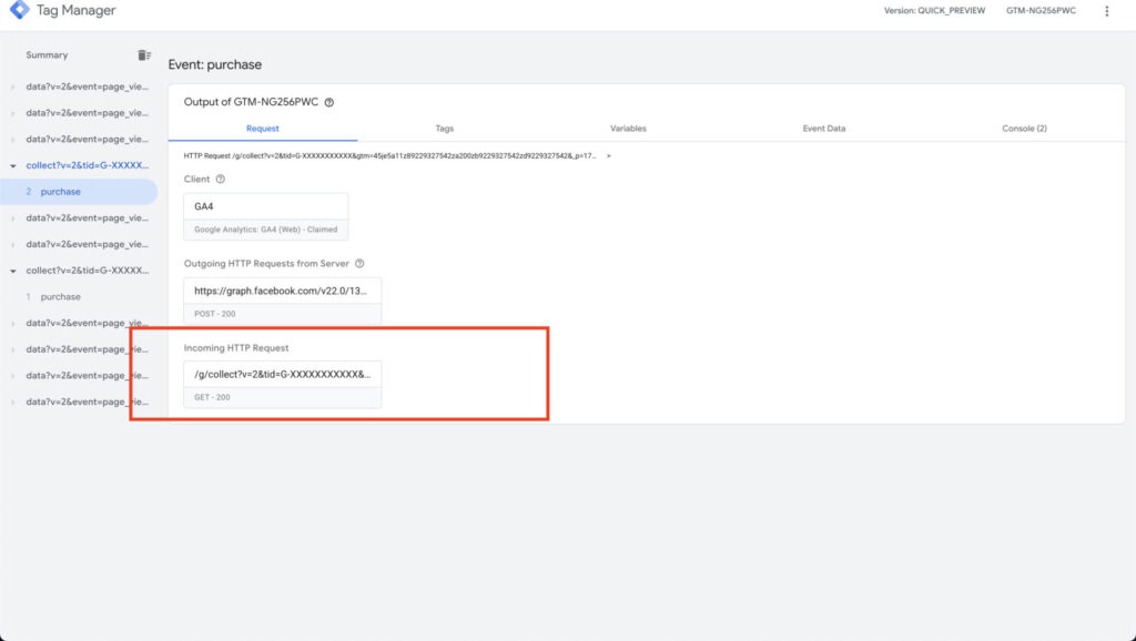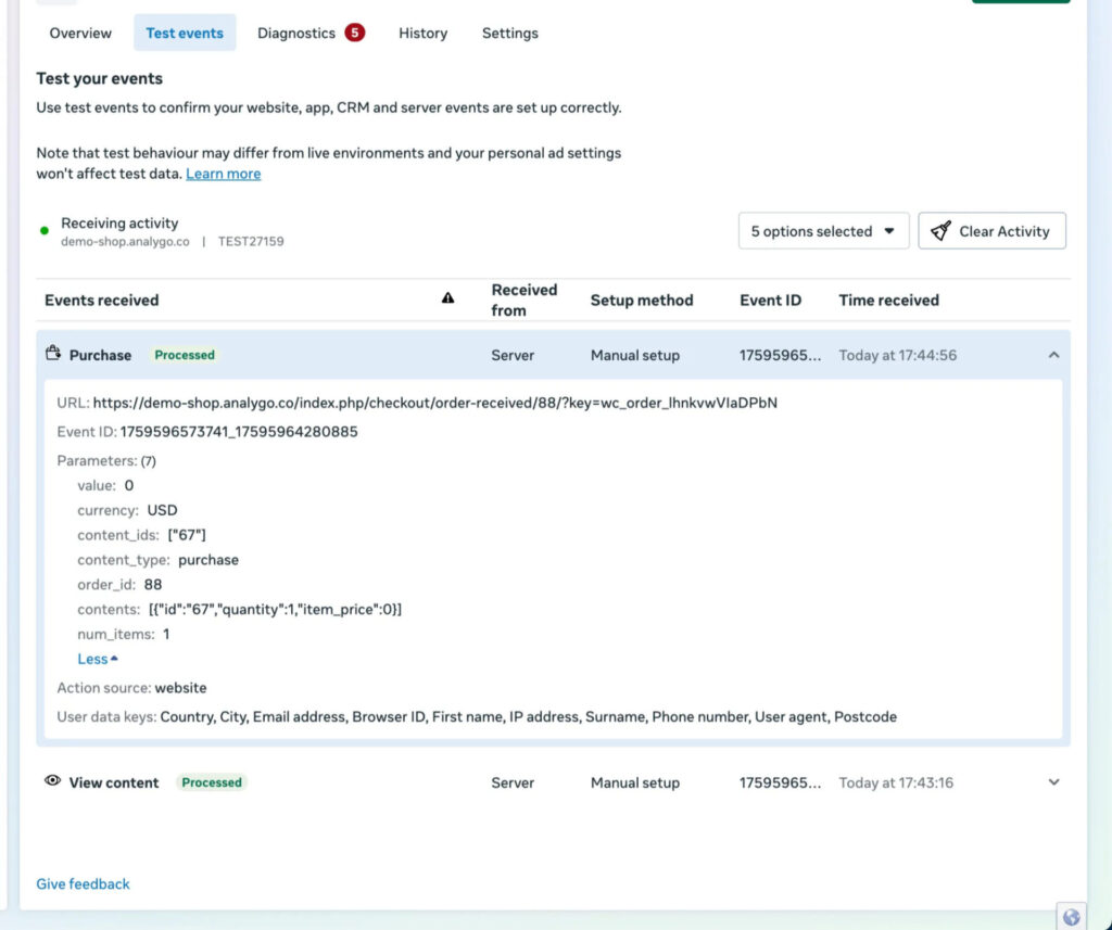 Section titled “Testing server configuration”Finally, let’s test our configuration. I will get a test code from Facebook Events Manager to help us debug what parameters are passing correctly. All you need to do is get the test code from Meta’s Events Manager and then paste it in the testId section.