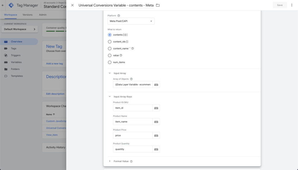 function() { var items = {{Data Layer Variable - ecommerce.items}}; if (!Array.isArray(items)) return []; return items.map(function(item) { return { id: item.item_id, name: item.item_name, content_category: item.item_category, item_price: item.price, quantity: item.quantity }; });}If you don’t want to use JavaScript, another alternative is to rely on Universal Conversions variable. How it works is fairly simple: you provide it with the items array, add the names of the parameters (e.g., item_name), and it will map this to Facebook’s format.
