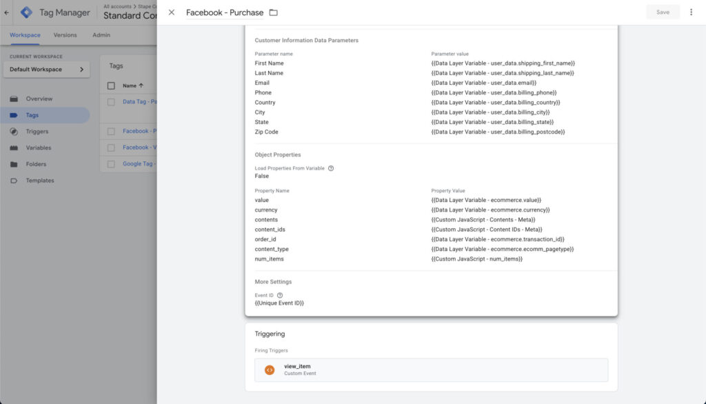 { "event": "purchase", "ecomm_pagetype": "purchase", "ecommerce": { "transaction_id": "71", "affiliation": "Online Academy", "value": "160.00", "tax": "0.00", "shipping": "0.00", "currency": "USD", "coupon": "SAVE20", "discount_amount": "40.00", "items": [ { "item_name": "GTM - course", "item_brand": "Analygo", "item_id": "67", "item_sku": "GTM-COURSE-67", "price": "100.00", "imageUrl": "https://example.com/images/gtm-course.jpg", "item_category": "Analytics", "discount": "20.00", "quantity": 1, "index": 1 }, { "item_name": "GA4 - course", "item_brand": "Analygo", "item_id": "68", "item_sku": "GA4-COURSE-68", "price": "100.00", "imageUrl": "https://example.com/images/ga4-course.jpg", "item_category": "Tracking", "discount": "20.00", "quantity": 1, "index": 2 } ] }, "user_data": { "customer_id": "CUST-00071", "billing_first_name": "Alex", "billing_last_name": "Morgan", "billing_address": "123 Elm Street, Apt 4B", "billing_postcode": "10001", "billing_country": "US", "billing_state": "NY", "billing_city": "New York", "billing_email": "alex.morgan1987@example.com", "billing_phone": "+1-212-555-0183", "shipping_first_name": "Alex", "shipping_last_name": "Morgan", "shipping_address": "123 Elm Street, Apt 4B", "shipping_postcode": "10001", "shipping_country": "US", "shipping_state": "NY", "shipping_city": "New York", "shipping_phone": "+1-212-555-0183", "email": "alex.morgan1987@example.com", "new_customer": "true" }, "gtm.uniqueEventId": 7}All we have to do is to map these values using the documentation. Let’s start by adding the web Facebook tag along with other all relevant fields.