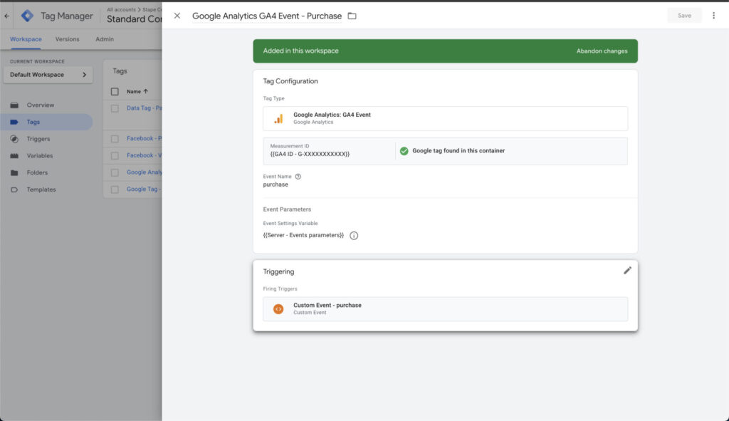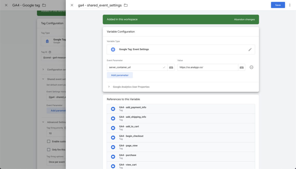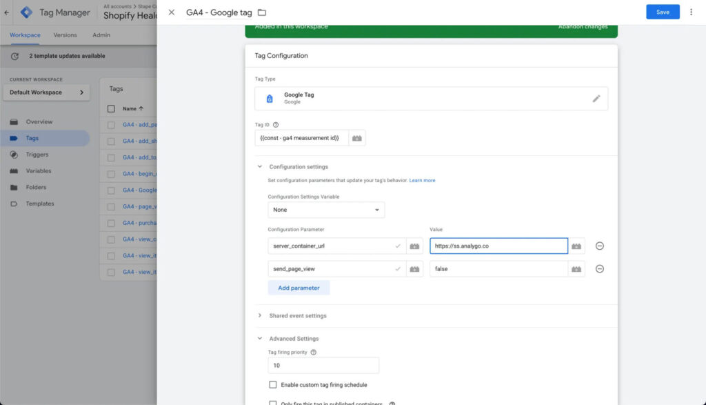 Since we created a shared events setting earlier, we won’t need to add parameters such as server URL for each individual tag. All parameters we need will be available by default as long as we don’t forget to add the event settings variable.
