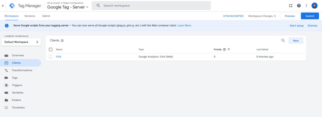 Section titled “GA4 Client”Make sure you have a GA4 client in the client section. This client is typically included by default when you create a new server container.