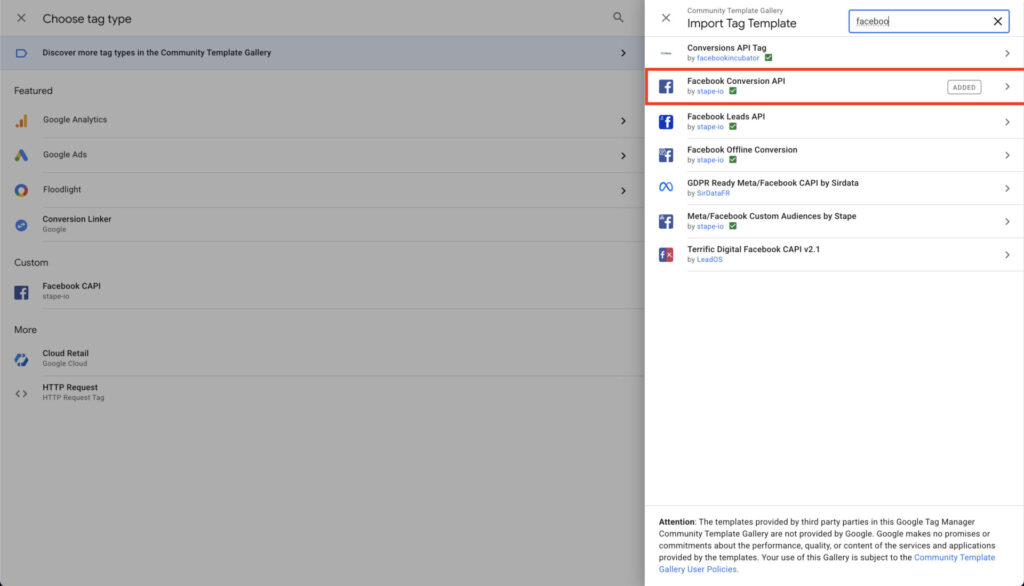 Next, navigate to the tags section and search for “facebook” in the tags templates library. You will find a Facebook template by Stape that we’ll be using.