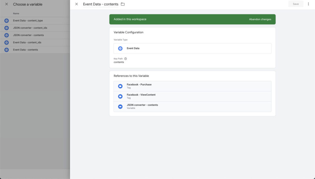 Alternatively, you can use a variable like items and let the Facebook server tag handle the rest, but we prefer to control what data is passed and how (adding our custom logic).