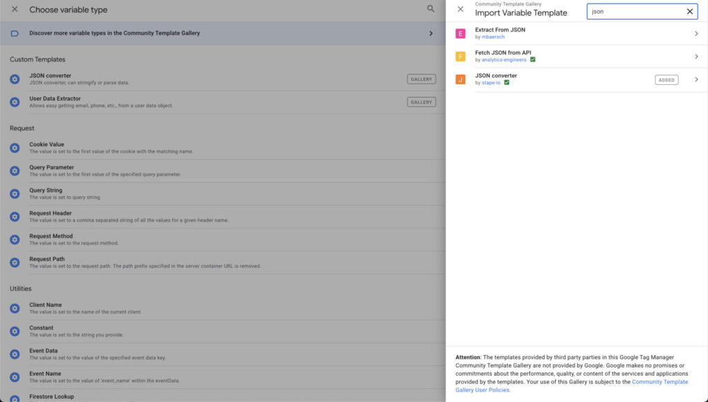 We will use a template by Stape called JSON converter. It will parse the string and convert it back to JSON format.