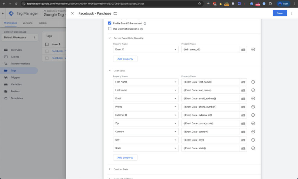 We will add the event ID in the server event data override section. This will help us with deduplicating data we send from the browser. In the User Data section, we will add the user’s personal information using the same event data variable we used for other variables.