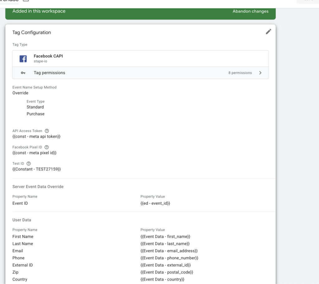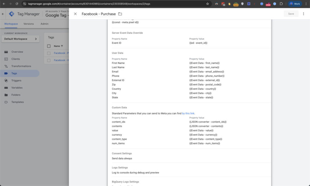 Section titled “Adding parameters to the Facebook server-side tag”Now that we have fetched parameters from the event data, we only need to include them in the Facebook server tag. Similarly to the purchase event on the browser side, we will use a purchase tag for the server part.