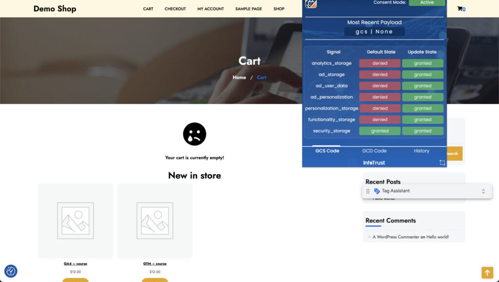 Now if we return to our site and deny cookies, preview mode will show that no tags were fired.