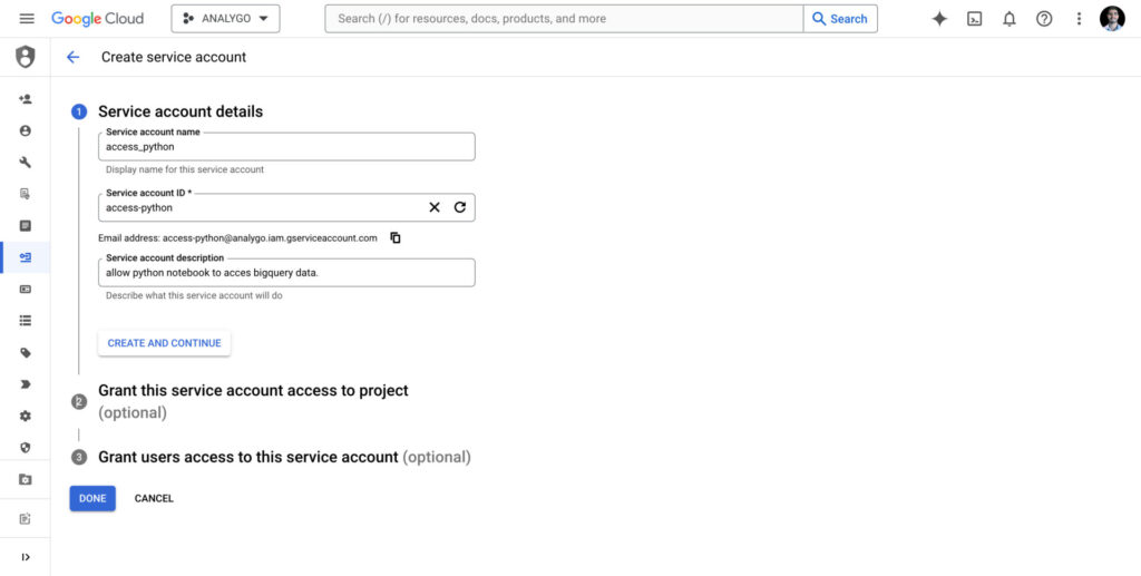 Service accounts are similar to your Gmail or any other access you have to a platform. They allow our python notebook to communicate with BigQuery and perform certain tasks like reading tables.