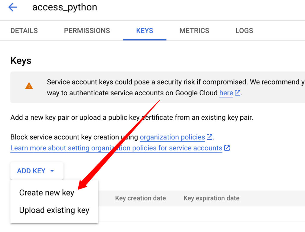 Create a new key and select the option JSON. The new file contains the key we need to authenticate. Open your Notebook and upload the file within the same file you will be working with. It’s a good idea to create a file for this project.