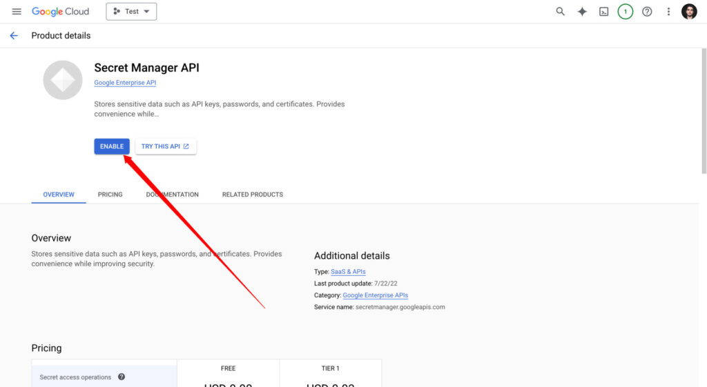 Next, make sure that the Secret Manager API is enabled as well. It will help us store any sensitive data in safety.
