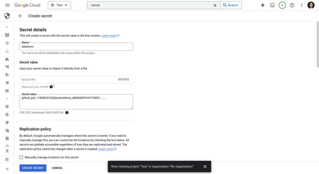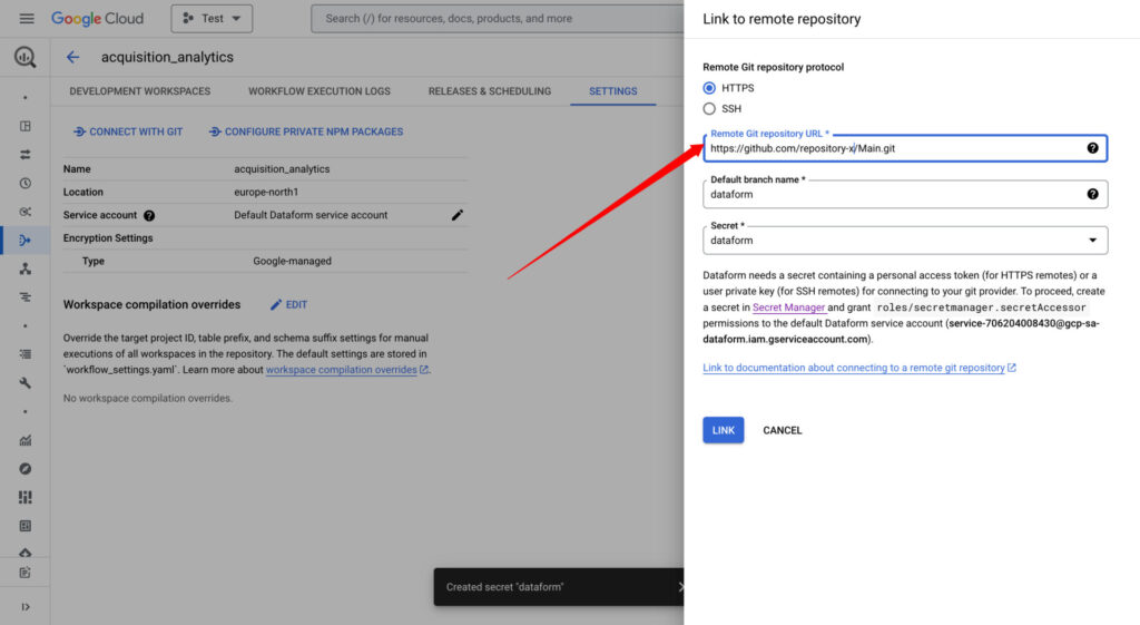 Go back to Dataform and create a secret using the secret manager API we enabled earlier.