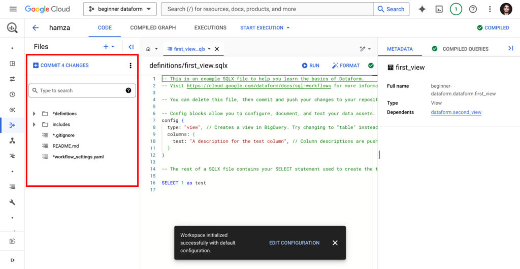 Finally, after clicking on your workspace, you can write some actual code in Dataform. Lets tart by initializing our workspace.