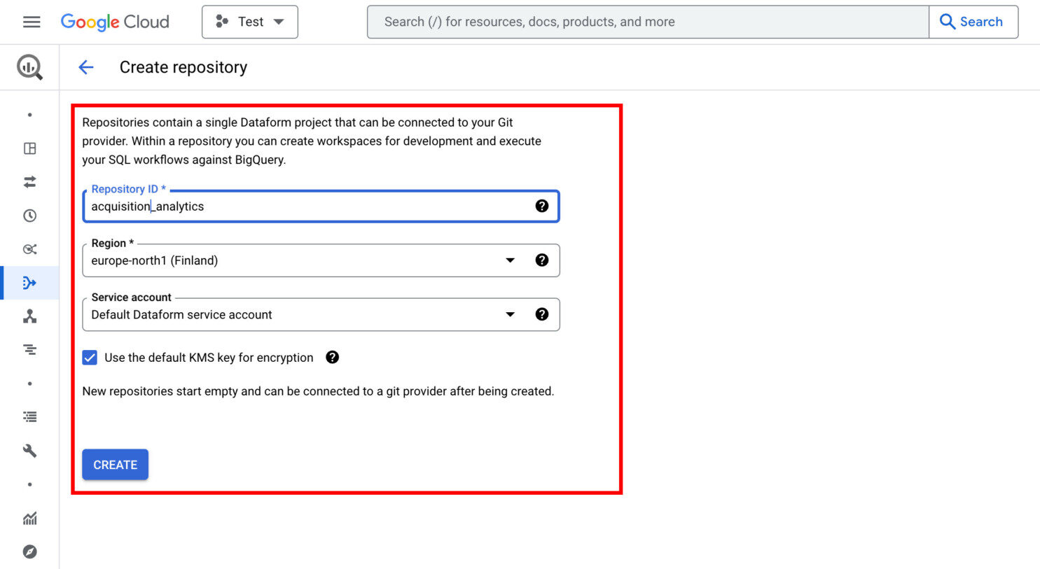 Section titled “Create a repository”Repositories are like folders for your projects. Before creating our files for queries, we need to have a repository to host them. Create a new repository by browsing to Dataform.