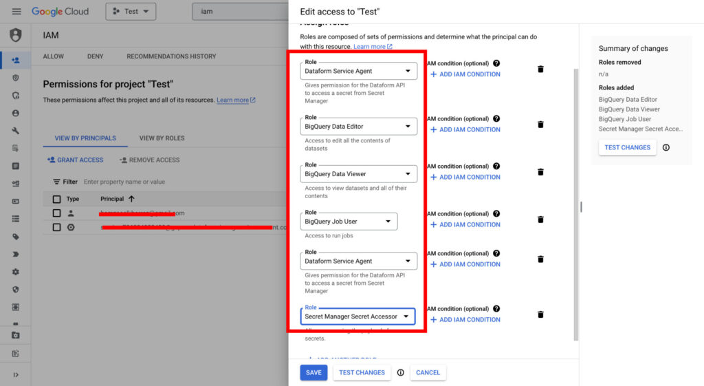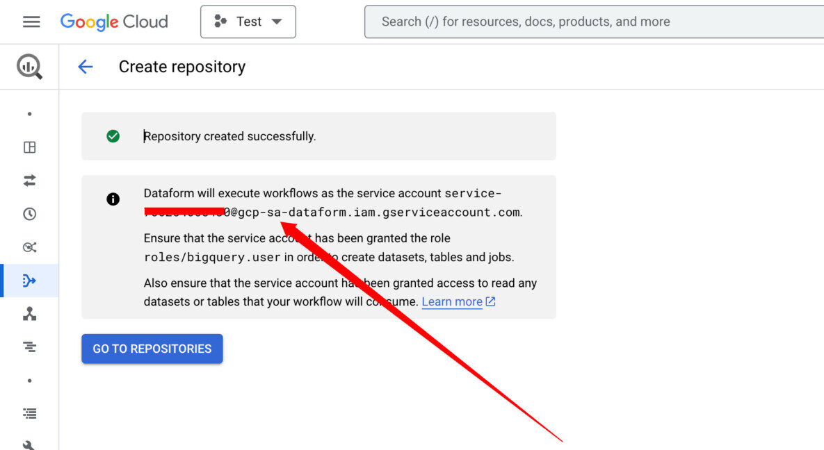 Look for the address we used earlier to create the repository. The name you should look for is Dataform Service Account.