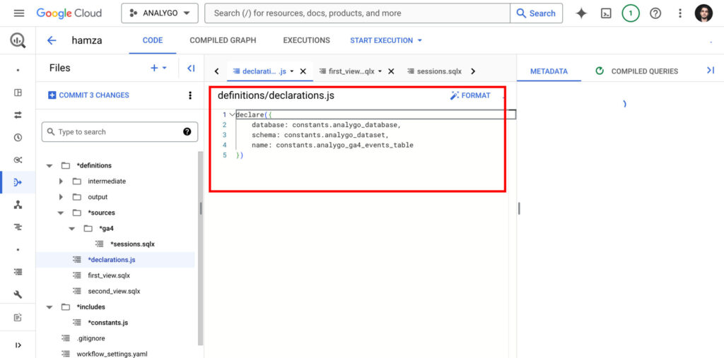 Section titled “Using JavaScript in Dataform”Let’s say we want to reference our table analygo.analytics_428839355.events_2024* in other queries without having to remember our data source name each time.
