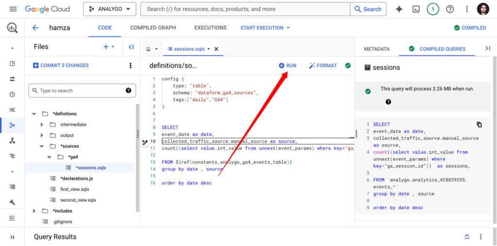 Section titled “Creating a SQLX query in Dataform”Let’s go ahead and create our first query. We will create a very simple table to display our sessions counts for each day.