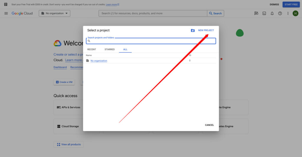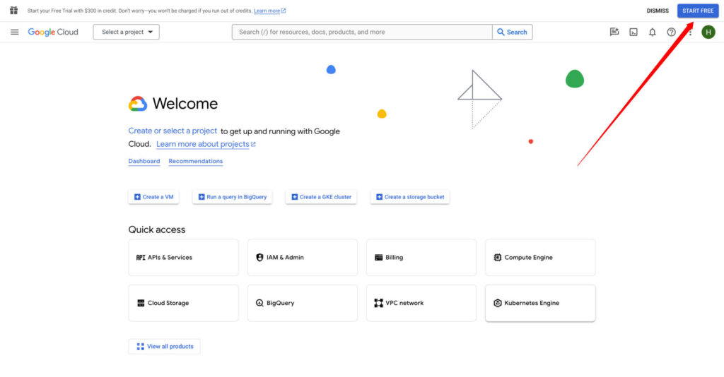 Section titled “Step #1: Configure Cloud Project and admin API”First, Browse to Google Cloud, and create an account by clicking on START FREE,