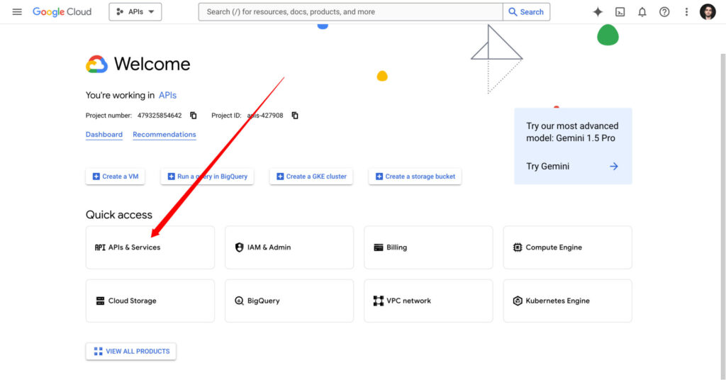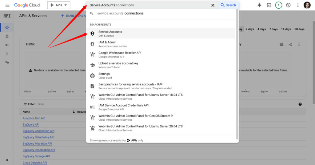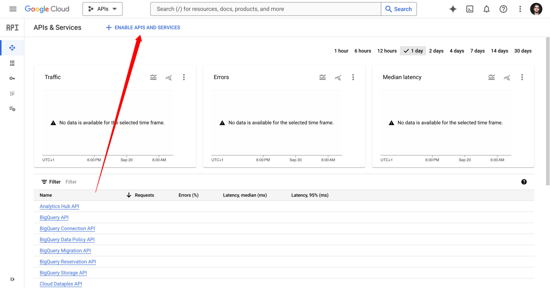 Section titled “Step #2: Enable the admin API”We have a Google cloud project, it’s time to enable our GA4 Admin API. Make sure you are on the project you created. Click on APIs & Services.