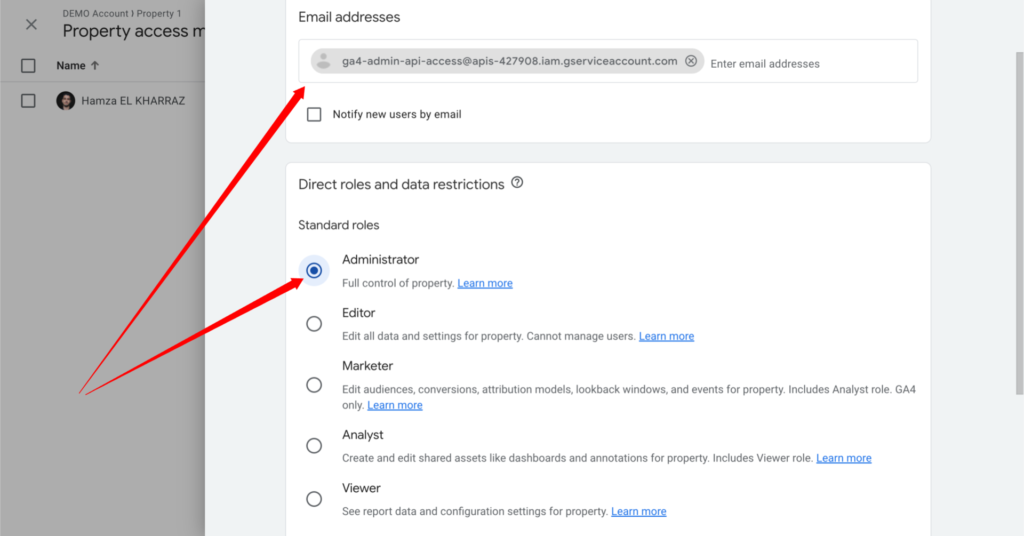 random_name@apis-427908.iam.gserviceaccount.comGo To GA4 account and add the email address.