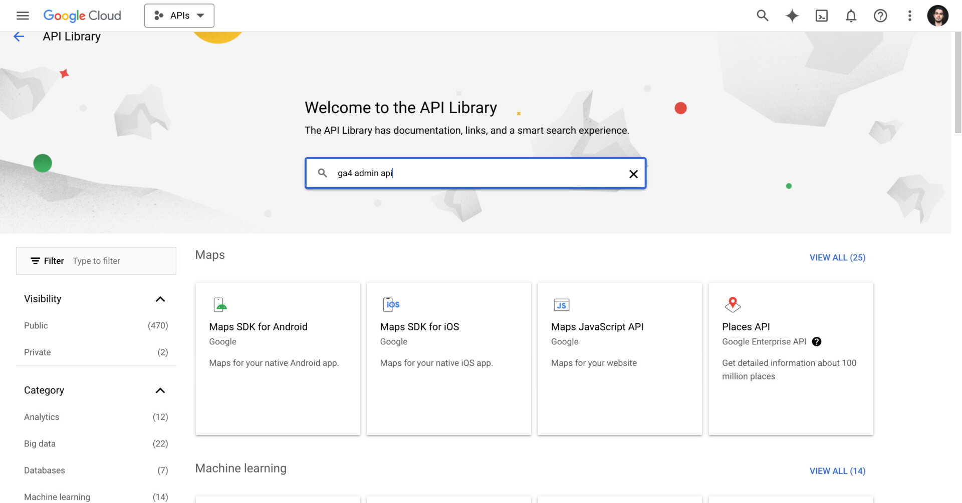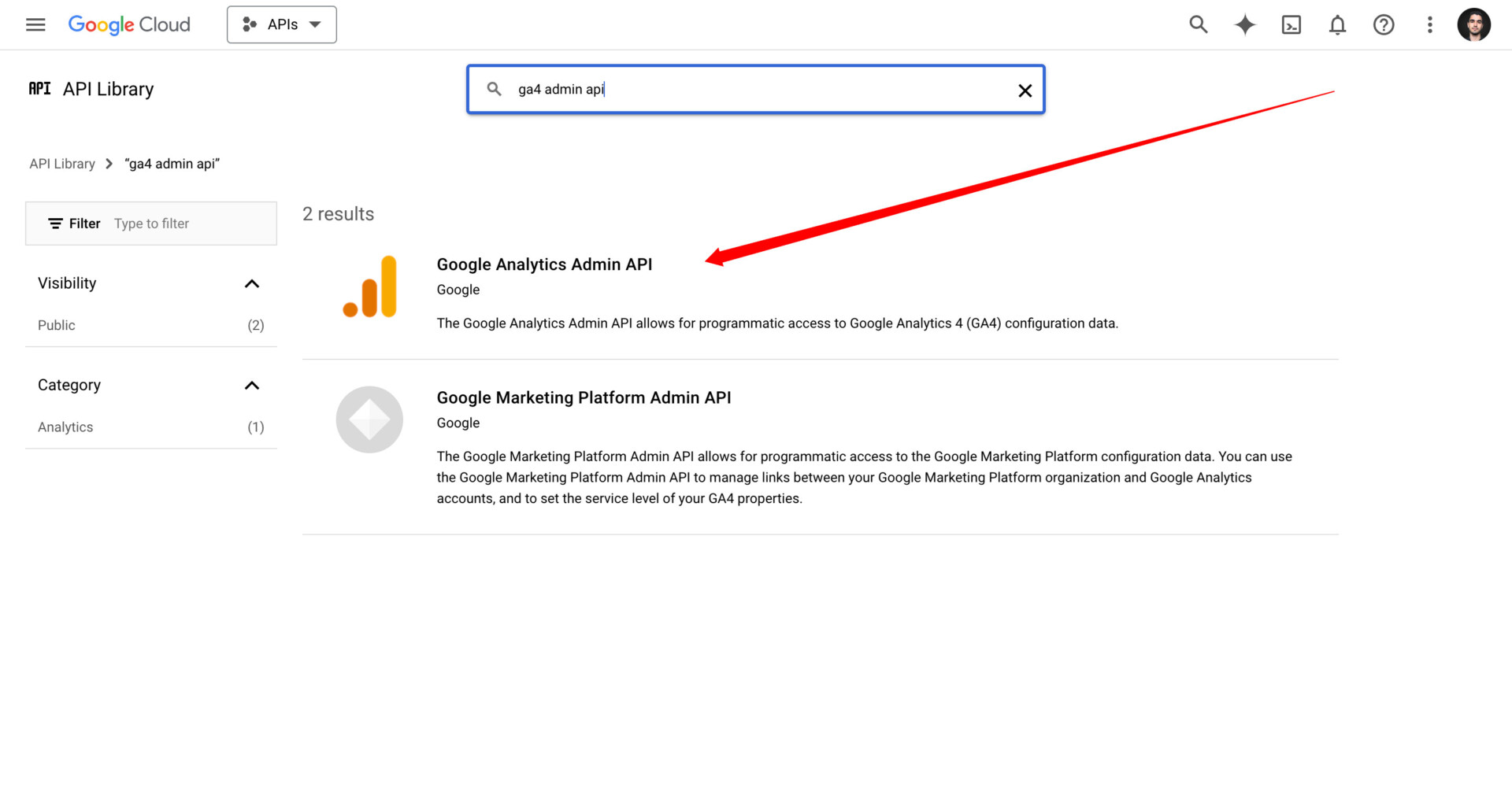 After clicking on Enable APIs & Services, search for GA4 Admin API and enable it.