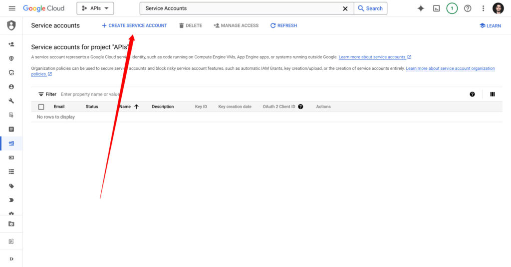 Section titled “Step #3: Create a service account”Search for **Service Accounts** and click on create service account.