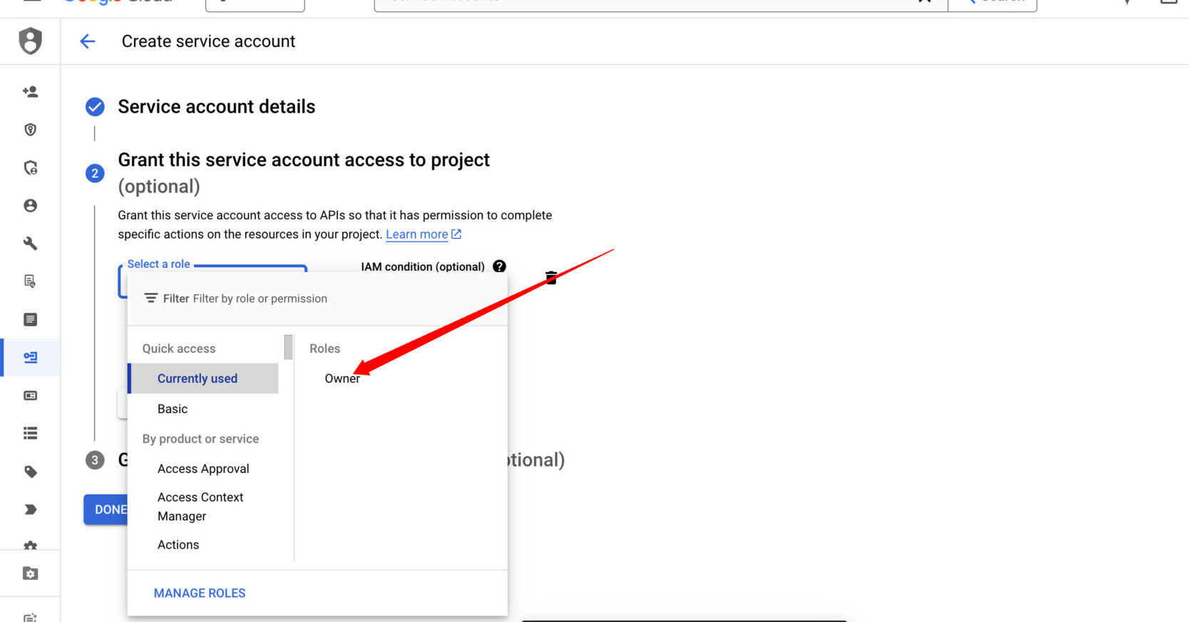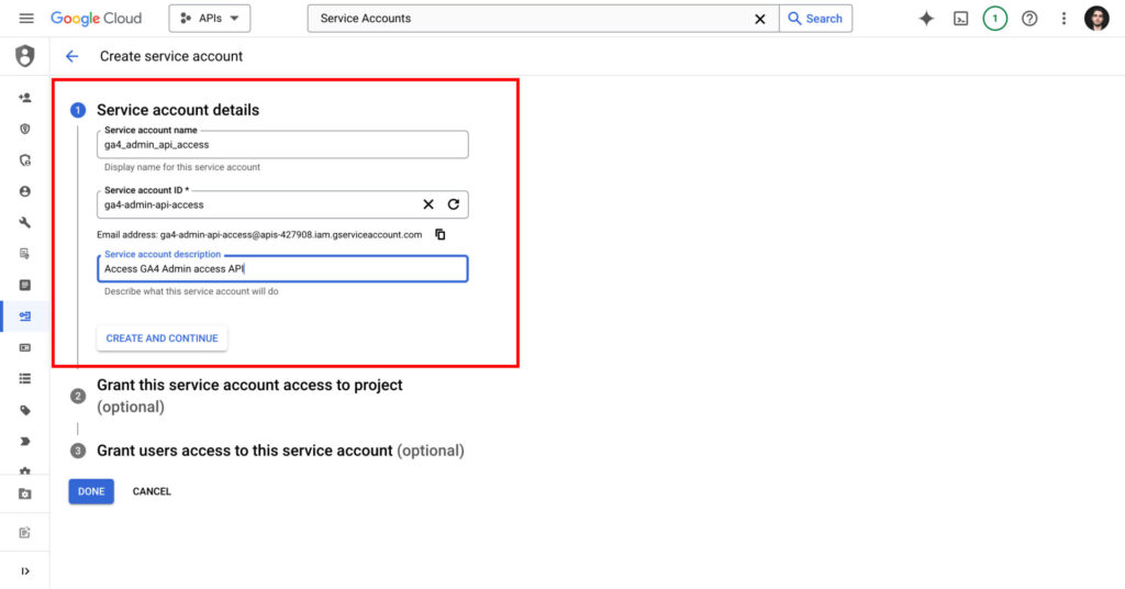Skip step 3️⃣ and click on Done. Finally, we are going to create and download the key. First, click on your service account email.