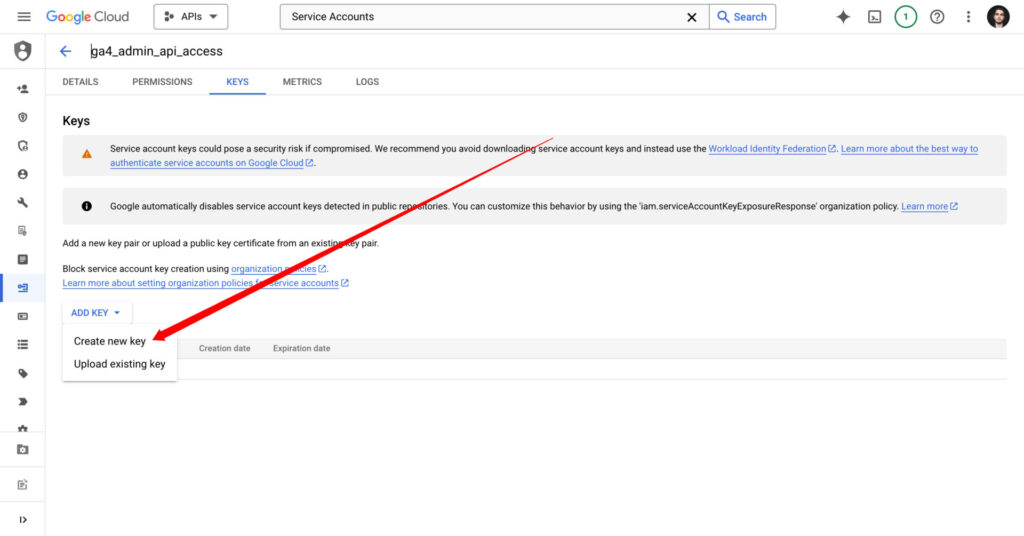 Section titled “Step #2: Set Up Authentication”You need to authenticate your service account to access the API securely. This involves using a JSON key file that contains your credentials.